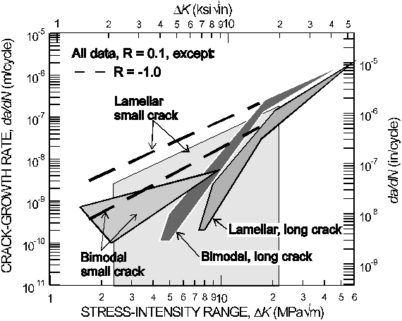Damage tolerant approaches to fatigue design commonly employ crack propagation rates measured for long cracks (e.g., crack size, a > 5 mm). Given the widely reported disparity between long and small (a < 0.5 - 1.0 mm) fatigue cracks [1-4], this approach must be deemed non-conservative. Indeed, a pronounced small-crack effect has been observed in Ti-6Al-4V (wt. %) with a variety of microstructures, with small cracks exhibiting i) faster propagation rates than long cracks at equivalent DK and ii) significant crack-growth rates at applied DK below the long-crack DKTH. In Figure 1, this point is illustrated using a compilation of literature data [5-9] for propagation rates of small, semi-elliptical surface cracks and long, through-thickness cracks in Ti-6Al-4V exhibiting both fully lamellar and bimodal (equiaxed primary a in a transformed b matrix) microstructures. In addition to clearly demonstrating the presence of a small-crack effect, Figure 1 also reveals that the relative fatigue-crack propagation resistance of these two common Ti-6Al-4V microstructures is dependent on defect size. In the case of long, through-thickness cracks, fully lamellar microstructures exhibit superior cyclic crack growth properties, with higher DKTH and lower growth rates at equivalent DK than the bimodal microstructures. Conversely, for small crack sizes (full surface crack length, 2c ~ 5-500 mm), the bimodal microstructures are better, with lower growth rates at equivalent values of DK. Additionally, small crack propagation rates in the lamellar microstructure exhibit far greater scatter. Although such small crack behavior has been well documented for constant amplitude, mode I loading on naturally initiated flaws, a detailed examination of this behavior is needed under the aforementioned surface and loading conditions which characterize gas-turbine engine HCF.